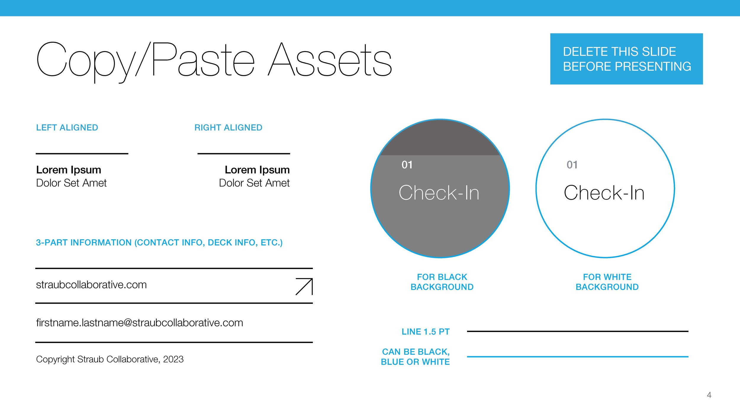 The core of the Straub Collaborative brand toolkit are the templated assets that we created. The team needed templates built in PowerPoint, Word and Excel. Below are some examples of the templated layouts that were included in the various PowerPoint files that we created.